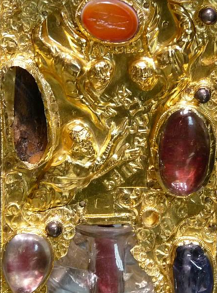 The Borghorst Cross is a priceless reliquary cross measuring 41,1 x 28,4 cm. It is made of gold plate covering a wooden core and embellished with gems, rhinestones and silver-pearls as well as three rock crystals covering 17 relics carefully wrapped in purple silk. Two of these rock crystals are Egyptian from the Fatimid era. The relics are listed on an inscription at the back and contains among others pieces from the true cross, the sponge, which moistened his lips, the bed of Mary and bones from a number of apostles and saints. On the arms of the cross are four gold-plates – on top the scene of the crucifixion and from the right to the left a procession of St. Damian, St. Peter, St. Paul and St. Cosmas worshipping the crucified Lord. Between the bottle – crystal and the lower fish-like crystal is a portrait of the German Emperor Henry III.This portrait is placed in the same location as other donor portraits on reliquary crosses from the same period.