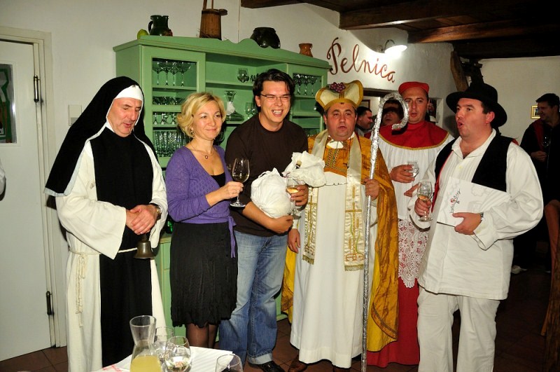 According to this the people in the region celebrated his day by rounding up the horses for the winter and slaughtering the first animals. Foremost, though, the saint was associated with wine and viticulture. Central to the celebrations were thus the so-called baptism of wine (Baptises Wine). This custom involves the baptism of the must and involves a banquet. Served is roasted goose with mlinci, a type of pancake. During the 20th century the feast had been strictly relegated to the private sphere or the church precinct. Now, it has been resurrected as a public celebration (once more).